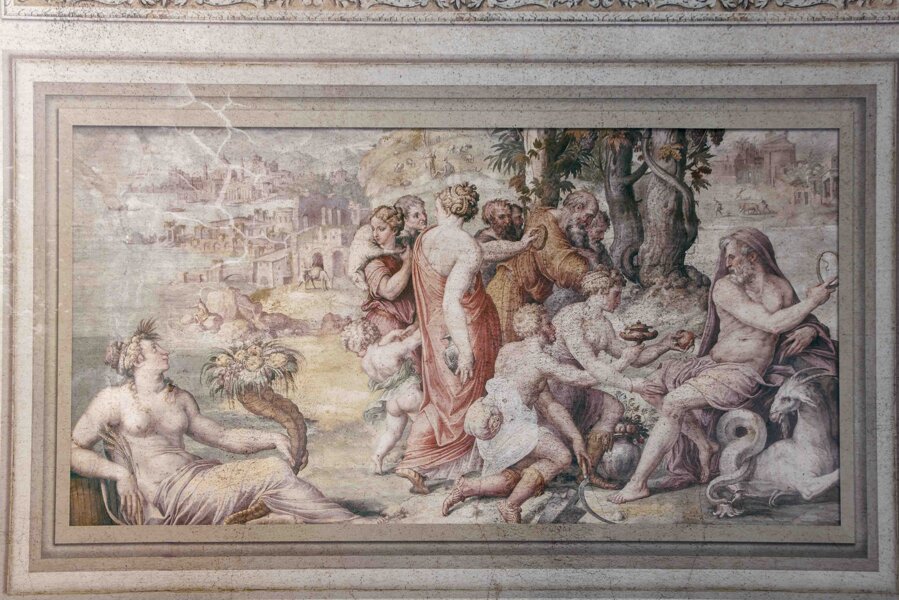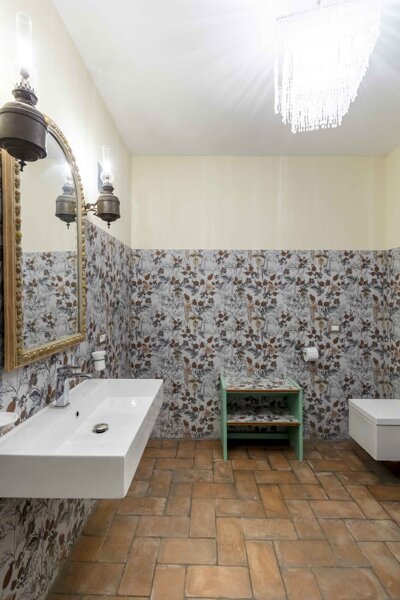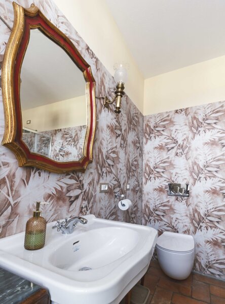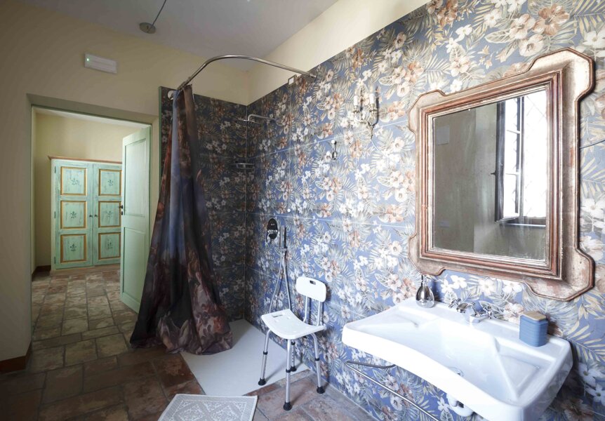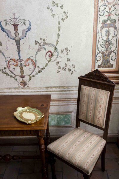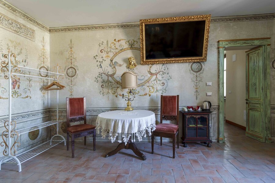 ricavata nell’abitazione settecentesca del Fattore, a seguito di un restauro conservativo, presenta ancora le pareti con eleganti decori affrescati. La pavimentazione in cotto antico, mantiene l’aspetto originario, le diverse sfumature ocra-rosso rendono particolarmente caldo l’ambiente.